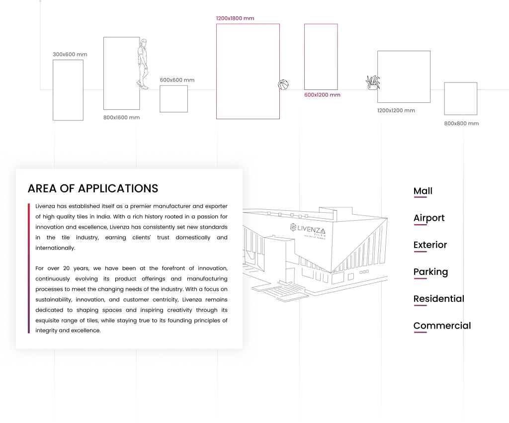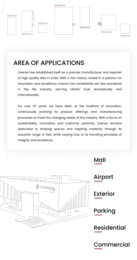For over 20 years, we have been at the forefront of innovation, continuously evolving its product offerings and manufacturing processes to meet the changing needs of the industry. With a focus on sustainability, innovation, and customer centricity, Livenza remains dedicated to shaping spaces and inspiring creativity through its exquisite range of tiles, while staying true to its founding principles of integrity and excellence.
